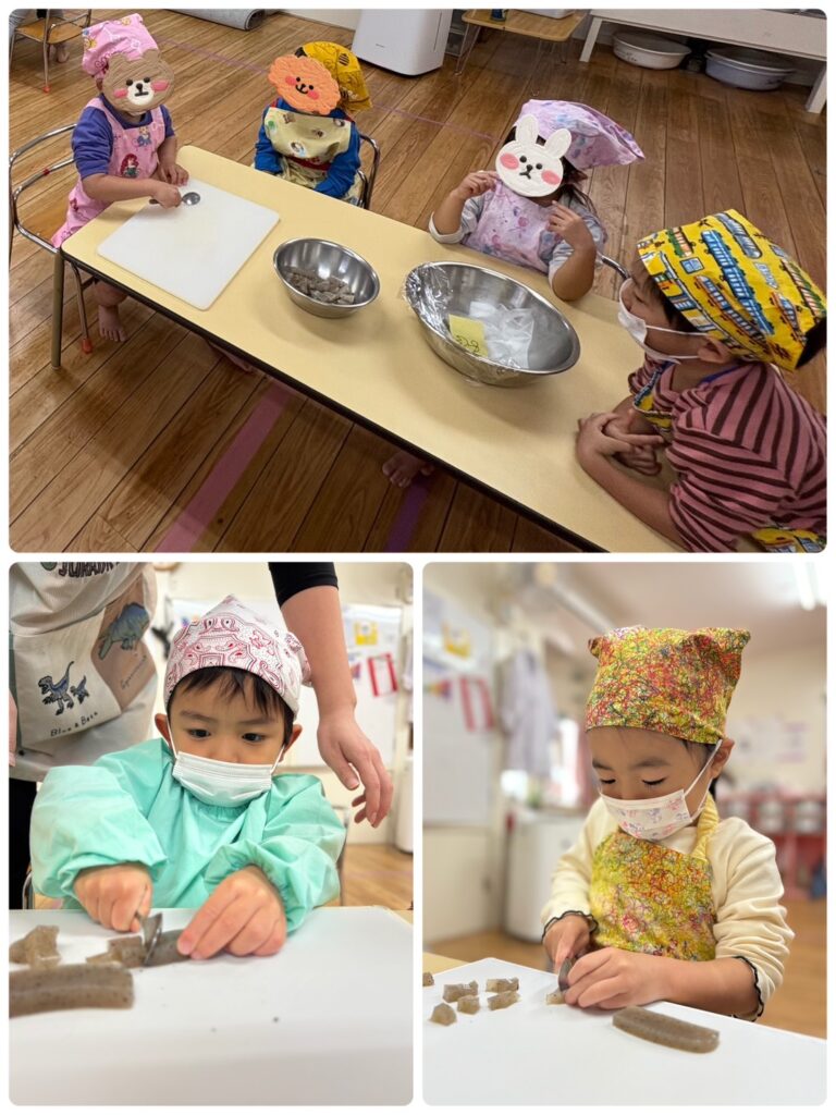 今日は、収穫感謝祭も兼ねて、みんなが楽しみにしていた芋煮会を行いました! 本来ではマイ保育園ひろばのお友だちにも参加してもらう予定でしたが、インフルエンザが流行…