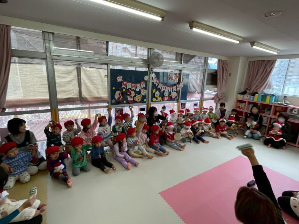 12月25日は子どもクリスマス会がありました。 乳児クラスは、ひよこ組とたんぽぽ組が一緒にクリスマス会を行いました。『あわてんぼうのサンタクロース』の歌に合わせ…