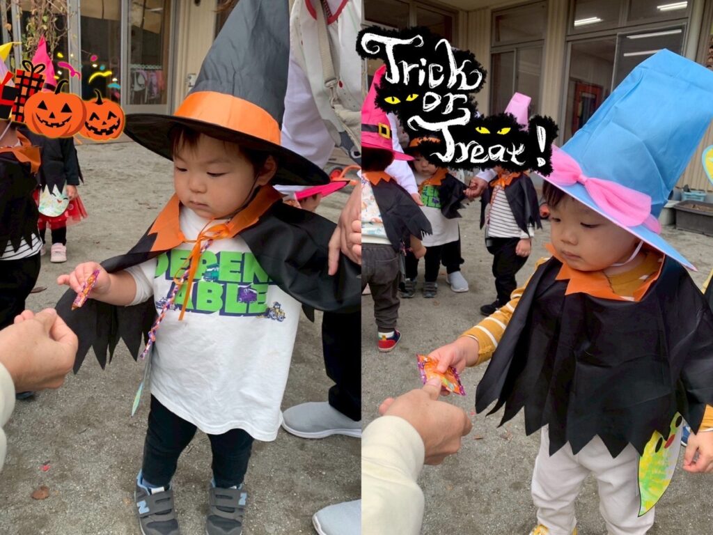 10月31日はハロウィン散歩に行きました! ひよこ組は、魔法使いの仮装をして出掛けました。保育者と一緒に「トリックオアトリート」「おかしちょうだいな」を言ってお…