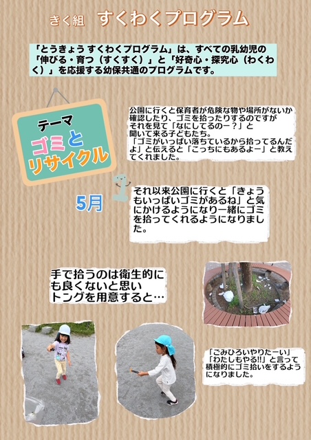 今年のすくわくプログラムの大きなテーマは”表現”。ちゅうりっぷ組に続き、きく組さんも第1弾がまとまりましたのでご報告します! テーマは”ゴミとリサイクル”。…