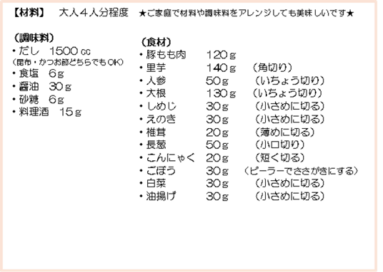 ★芋煮のレシピ★ 2024年11月12日(火) 食育 今日は収穫感謝祭にちなみ芋煮会でした。全クラスが芋煮に入る食材の下処理や切裁をお手伝いしてくれました!芋煮のレシピを掲載しますのでご家庭でもお試しください♡ 切り方などはお子様の年齢に合わせて変えてください♪自分たちがお手伝いした芋煮は格別だったようでたくさんおかわりをしてくれました! 各クラスの活動内容については別の記事で掲載します。 (給食室) ブログトップへ