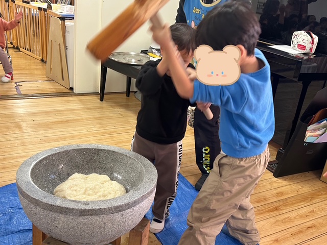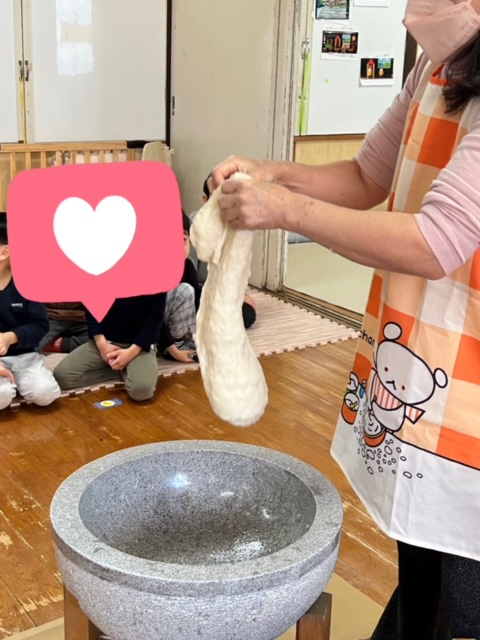 おもちつき体験 2025年1月8日(水) 食育 今日はおもちつき体験をしました。「どうやっておもちができるの?」「もち米っていつも食べているごはんとどう違うの?」興味津々な子どもたち、手作りの絵本を読んだり、うるち米ともち米を見比べてみたり、もち米を食べてみたり、クイズをしたりして学びました。 最初はつぶつぶだったもち米をこねこねして、「よいしょ!よいしょ!」とみんなで力を合わせてついたら、よく伸びるおもちになりました。元気いっぱい楽しいおもちつき体験になりました。(給食室) ブログトップへ
