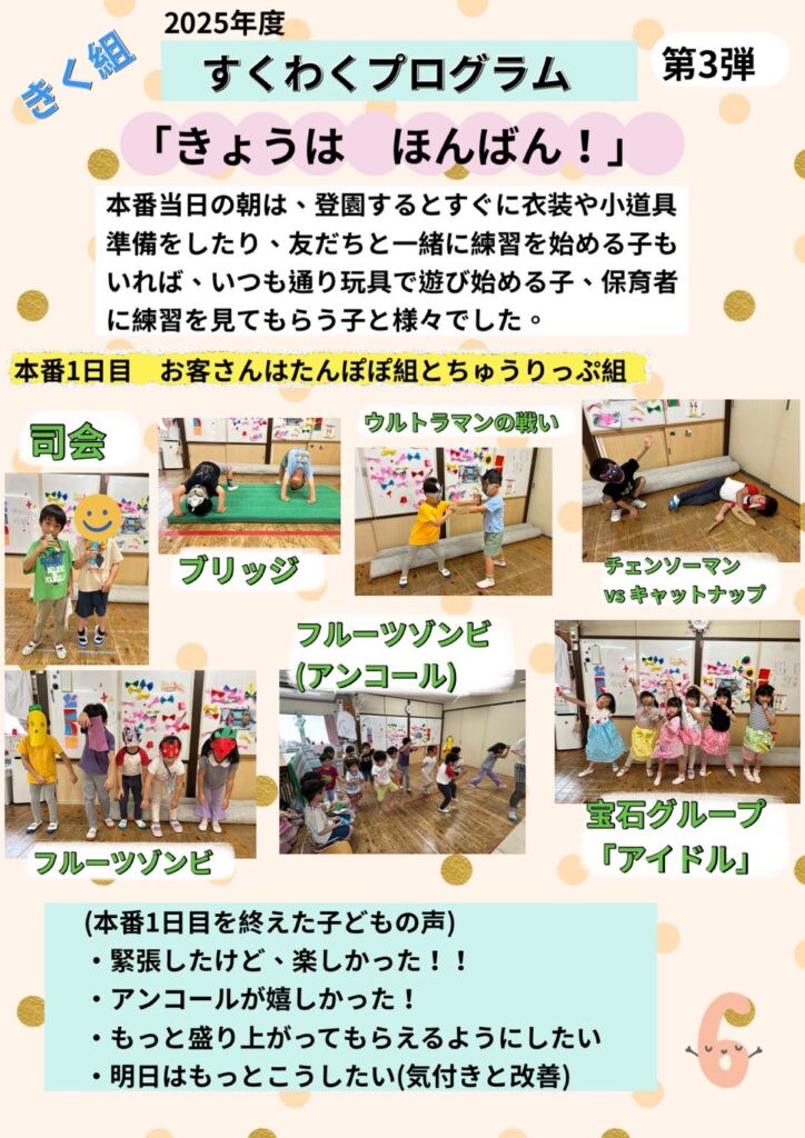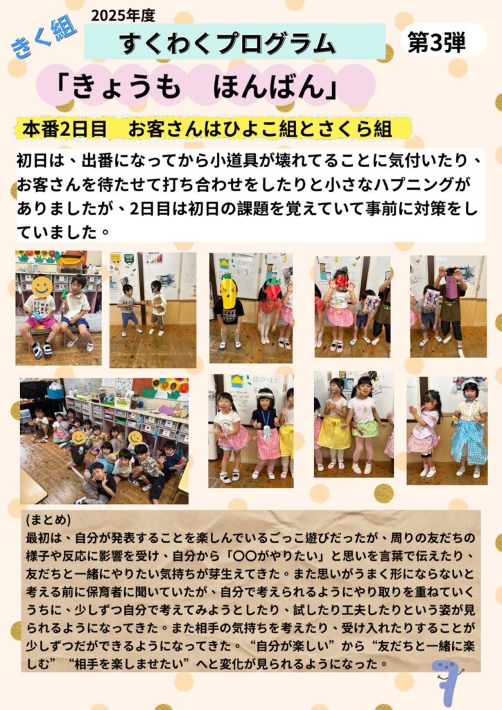きく組 すくわくプログラムⅠ(R7)第3弾! 2025年9月13日(土) すくわくプログラム さあ、いよいよ発表です! 他クラスのお友だちを招待し、2DAY sで行いました。 一日目の公演が終わり、2日目は「もっとこうしたい」と反省をして、次の日にそれを改善して、見事に大成功! アンコールが掛かると、まるでアーティストのような表情をしていたきく組さんでした。いつものごっこ遊びを自分達で一から作り上げ、発表する事で自信へと繋がったように感じます。これから就学に向けて更に色々な事へ挑戦をしますが、自らが目標を持って取り組めるように応援していきたいと思います。頑張れ、きく組さん!! ブログトップへ