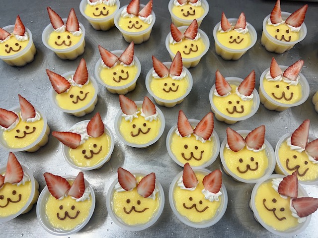 イースター給食 2025年4月23日(水) 食育 今日はイースターでした。 幼児組さんは園内に隠されたタマゴを探す、「エッグハント」を楽しんでいました。 探しながらも「カレーのいいにおい~」「おなかすいたー」という声が聞こえてきて、張り切っていた給食室です。 給食もイースターメニューです♪ 【給食】 うさぎちゃんカレー コーンサラダ ミネストローネ オレンジ 【おやつ】 うさぎちゃんプリン 今年も子どもたちが笑顔になるような楽しい行事食を作っていきたいと思います♪ (給食室) ブログトップへ