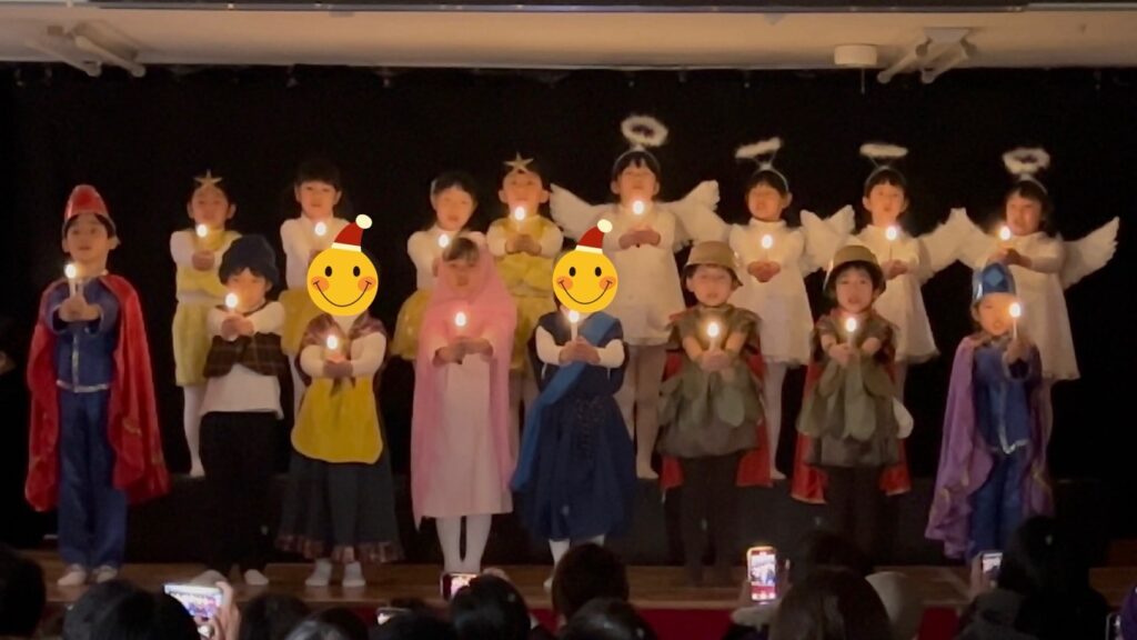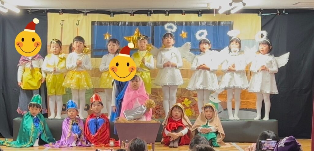 5歳児きく組はキャンドルサービスで「WE WISH YOU A MERRY CHRISTMAS!」を英語詞で歌い、聖劇「クリスマスのお話」 、歌「てをつなごう」を発表しました。