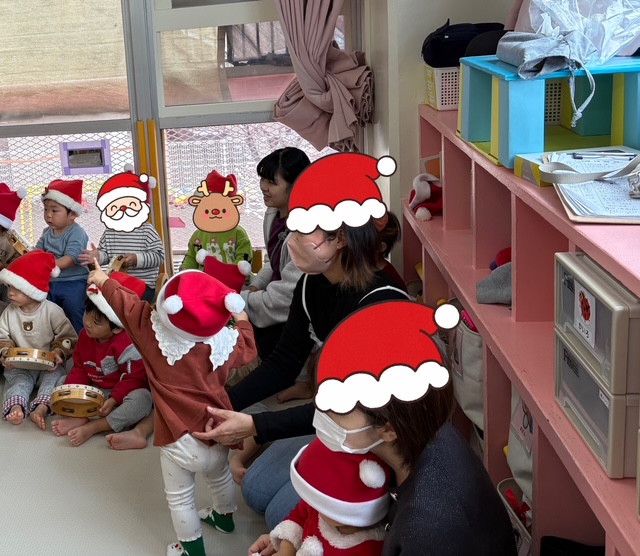 今日は子ども達が楽しみにしていた子どもクリスマス会! 1・2歳児は合同でひよこ組の保育室で行ったのですが、そこにマイ保育園ひろばのお友だちが3組参加してくれました。