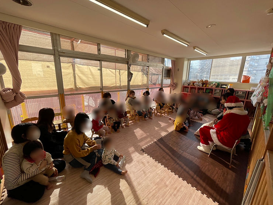 今日は子ども達が楽しみにしていた子どもクリスマス会。1歳児ひよこ組と2歳児たんぽぽ組合同でマイ保育園ひろばのお友だちも参加し、クリスマス会を楽しみました。