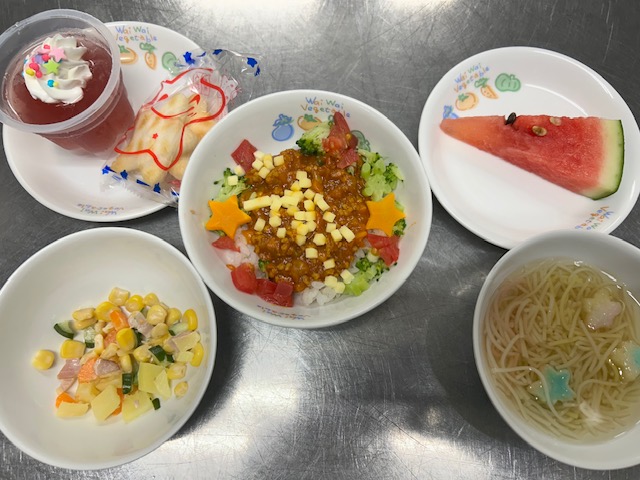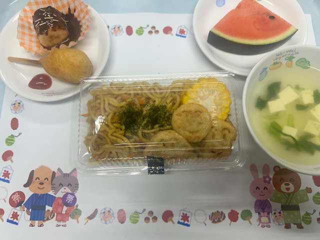 今日は夏まつりごっこでした。子どもたちはゲームや盆踊りを楽しんでいました。給食もおまつり仕様です! 給食・やきそば・ポテト・とうもろこし・豆腐スープ・すいか お…