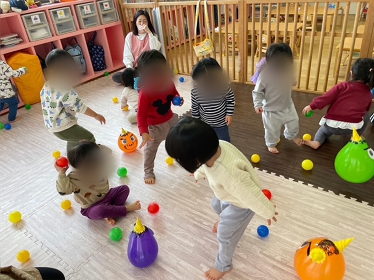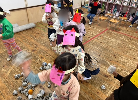 2月3日に節分をしました。ひよこ組は節分のスケッチブックシアターを見てから、段ボールや風船で作った鬼にカラーボールを投げました。一生懸命段ボール鬼の口にボール…