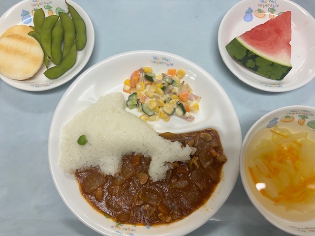 この日は夏の特別メニューで「イルカちゃんカレーライス」でした♪形が少し違うだけで子どもたちも大喜びでした!そしてデザートは旬のスイカ、おやつは旬の枝豆でした。ま…