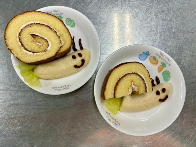 先日、梅雨入りしましたね。おやつではロールケーキにバナナ、あんこで顔を書いてかたつむりケーキを作りました!(旬のメロンを葉っぱに見立ててみました。) そのほか、…