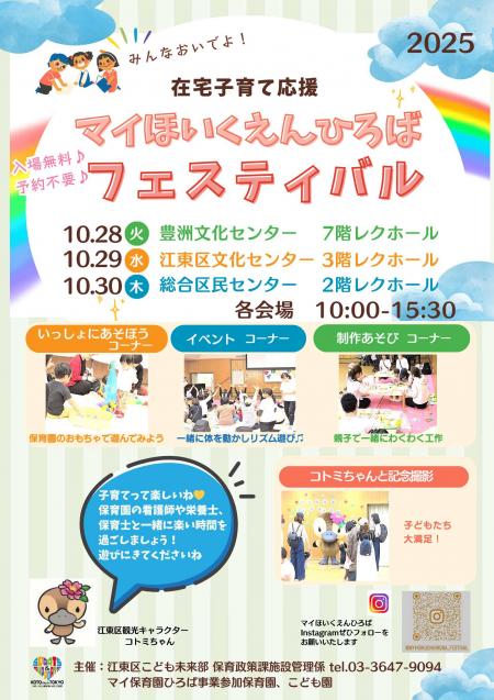 江東区の公立保育園、私立保育園、公設民営保育園とともに、在宅で子育てしている方のために、遊び場の提供や季節のイベントのお誘い、子育て相談などのマイ保育園ひろば事業を行なっています!