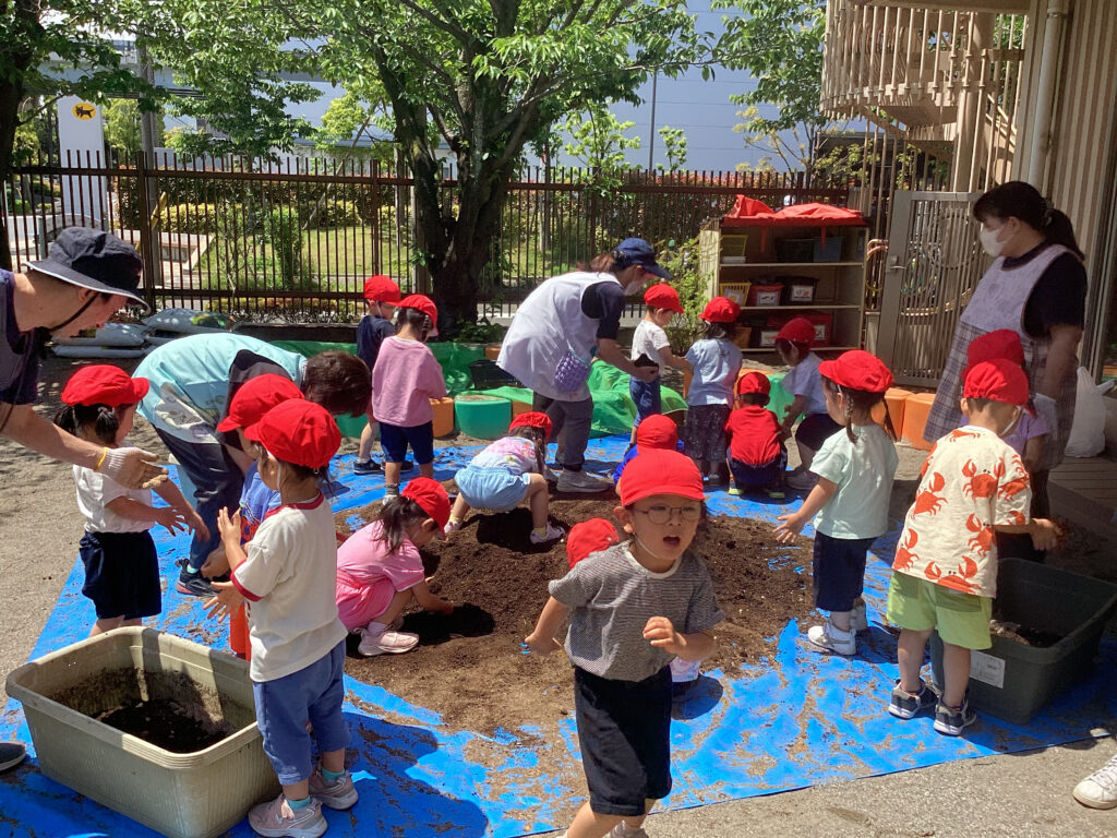 「テーマ:土」 ~夏野菜栽培の土作り①~ 「これから土作りをするよ。まず、みんなにプランターの土を運んでもらいたいんだ。」 「いいよー!」「任せて!!」 「よい…