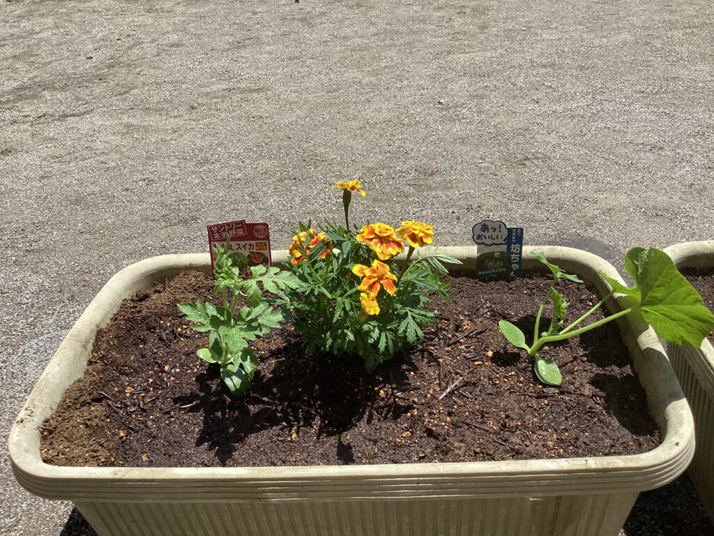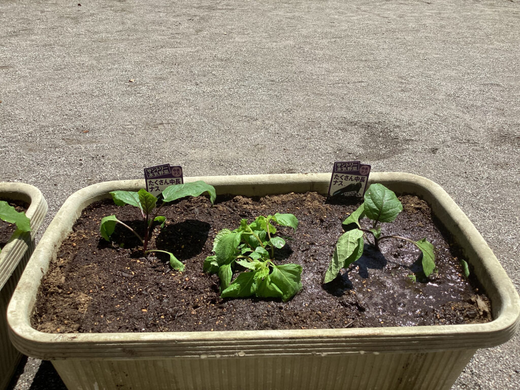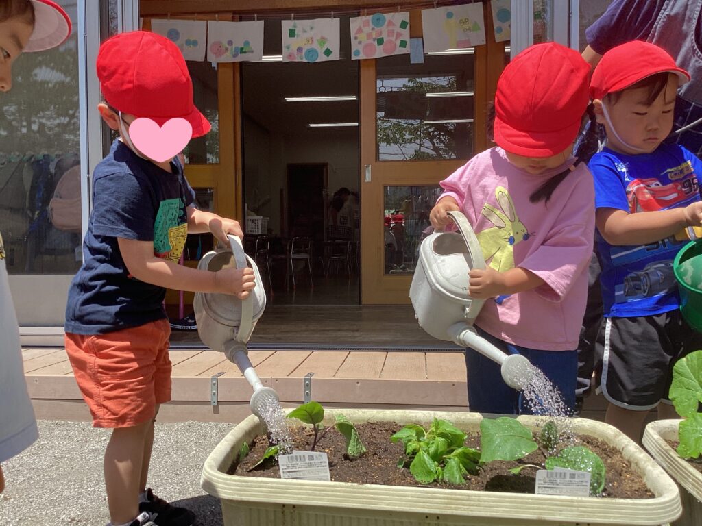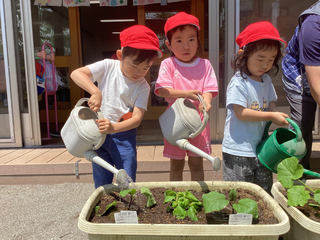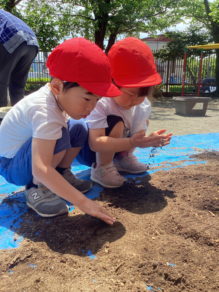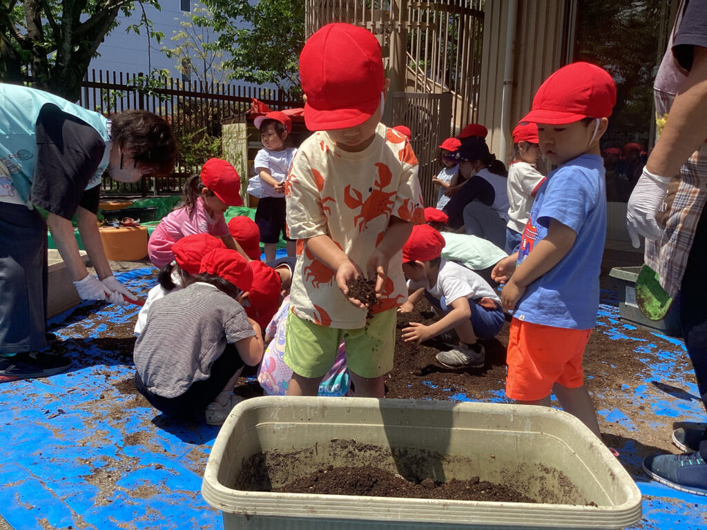 すくわくプログラム③(3歳児・うさぎ組) 2025年5月8日(木) すくわくプログラム ~夏野菜栽培の土作り② → 苗植え~ 「土が乾いたから、みんなで根っこ取りをしよう!!」 「根っこはどこかな~?」「パラパラ~」 「根っこって、これでしょ?あったよ!!」 プランターに土を戻していきます。新しい腐葉土も混ぜました。 素手で触れる土の感触も確かめながら・・・。 うさぎ組は「ナス、ミニカボチャ、スイカ」を植えました。 「順番に水やりをしようね。」 「おおきくなーれ♬」 大きく育ってね🎵 ブログトップへ